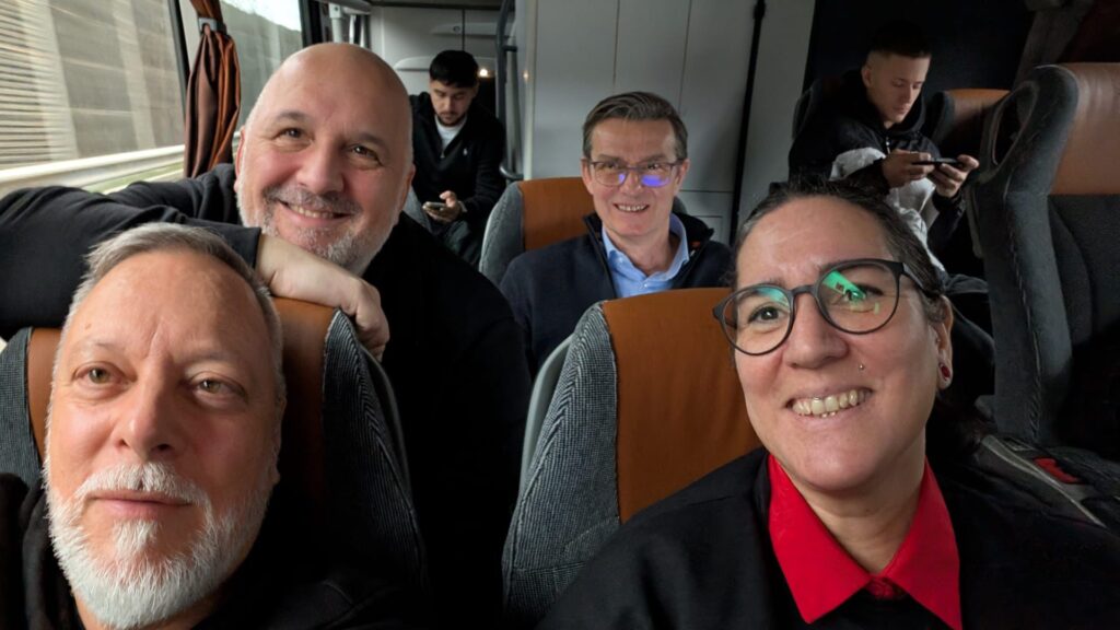 Gute Stimmung im Bus: das Lehrer:innenteam der BS Bau mit Alfred Kunz, Mario Weber, Jan Arnold und Alexandra Rausch.