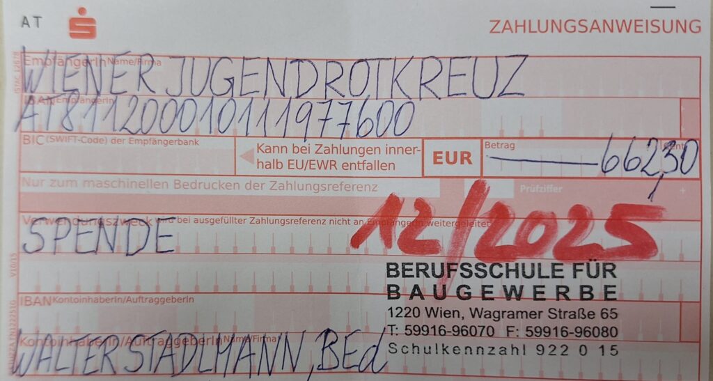 Unserem Kollegen Walter Stadlmann ist es zu verdanken, dass mehrmals jährlich eine Spendenbüchse durch sämtliche unserer Klassen wandert, mit dem Ziel, Geld für das Jugendrotkreuz zu sammeln. Dank der Großzügigkeit und der sozialen Einstellung unserer Schüler:innen konnten wir auch diesmal wieder eine stattliche Summe lukrieren, und zwar in Höhe von 662,30 EUR! Vielen Dank an alle, die dazu beigetragen haben, dass das Wiener Jugendrotkreuz in seiner Arbeit und seinem Einsatz für die Bevölkerung weiter unterstützt wird!