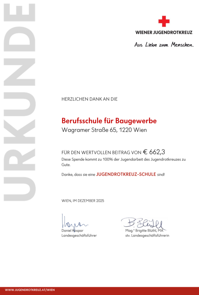 Unserem Kollegen Walter Stadlmann ist es zu verdanken, dass mehrmals jährlich eine Spendenbüchse durch sämtliche unserer Klassen wandert, mit dem Ziel, Geld für das Jugendrotkreuz zu sammeln. Dank der Großzügigkeit und der sozialen Einstellung unserer Schüler:innen konnten wir auch diesmal wieder eine stattliche Summe lukrieren, und zwar in Höhe von 662,30 EUR! Vielen Dank an alle, die dazu beigetragen haben, dass das Wiener Jugendrotkreuz in seiner Arbeit und seinem Einsatz für die Bevölkerung weiter unterstützt wird!