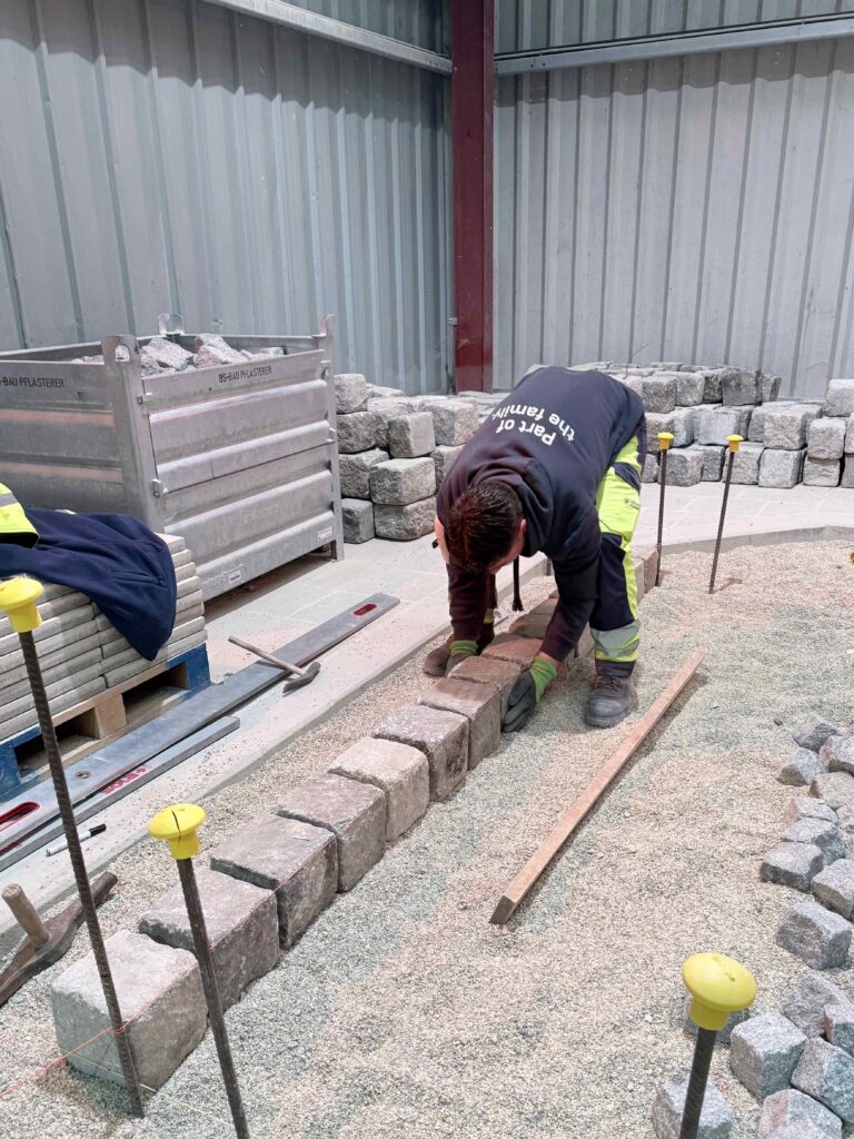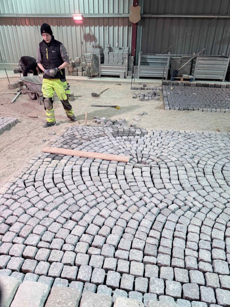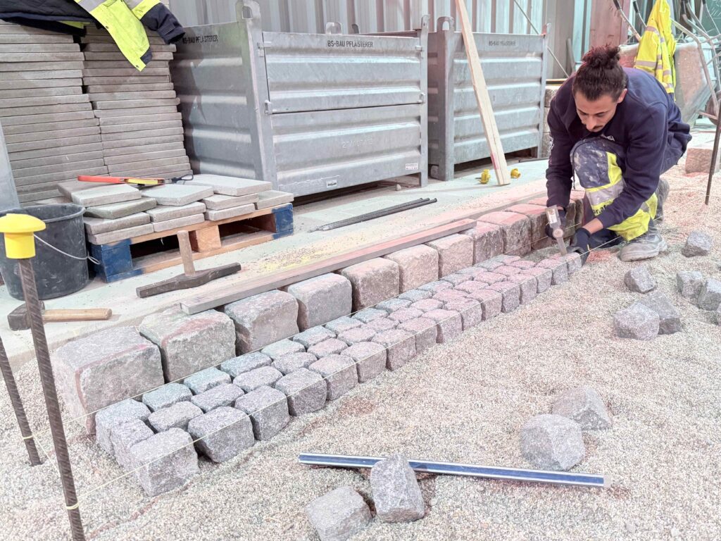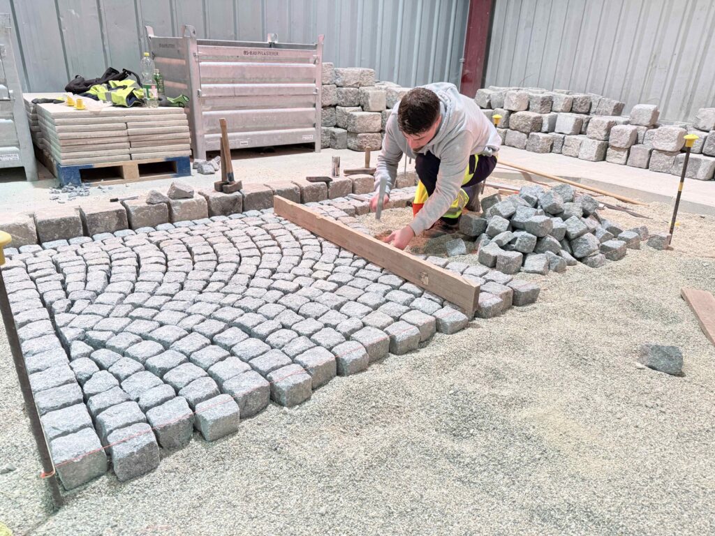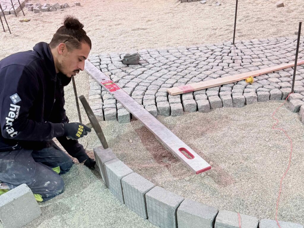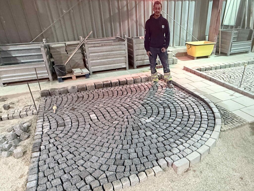 Granit-Kleinpflaster: Ausführung von Segmentbogen einschließlich Sonderformen und Richtungswechseln, Spitzgraben, Reihenpflaster sowie Kreispflasterungen.