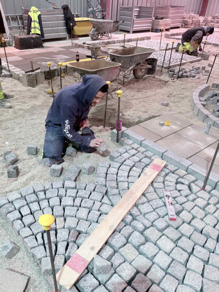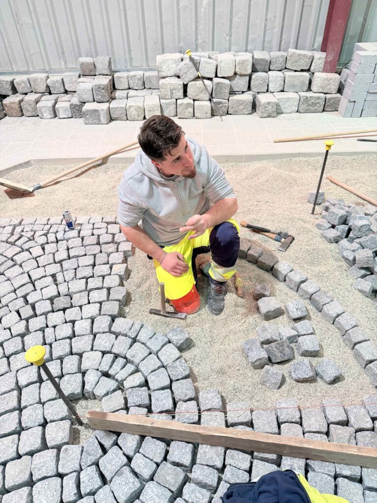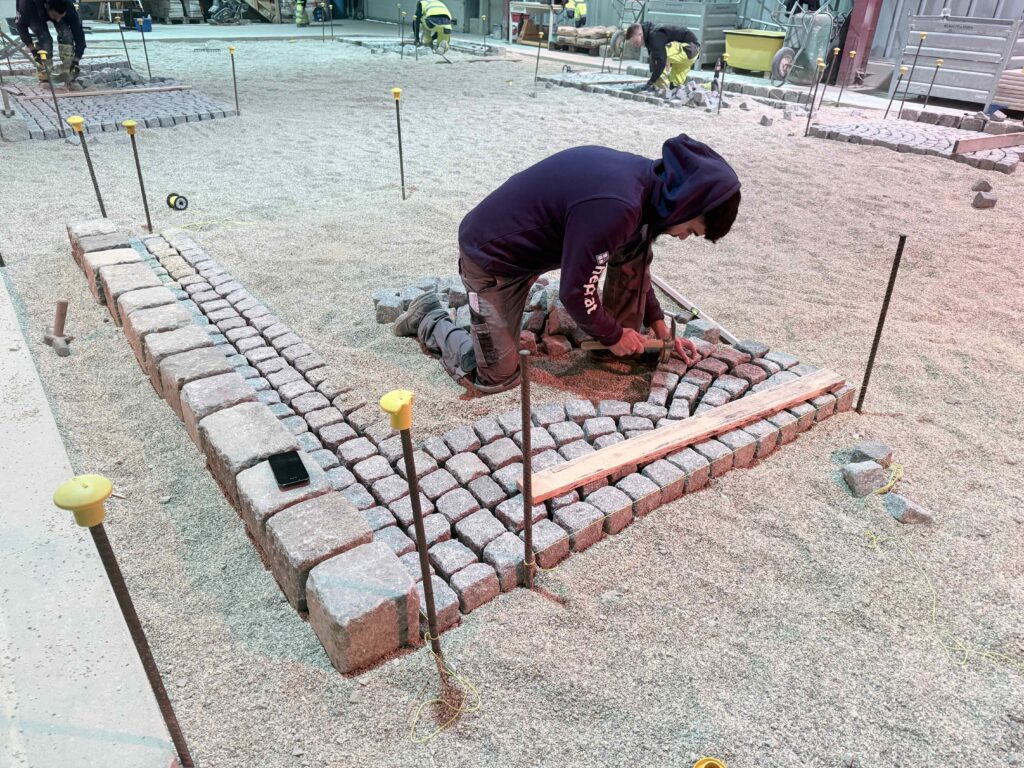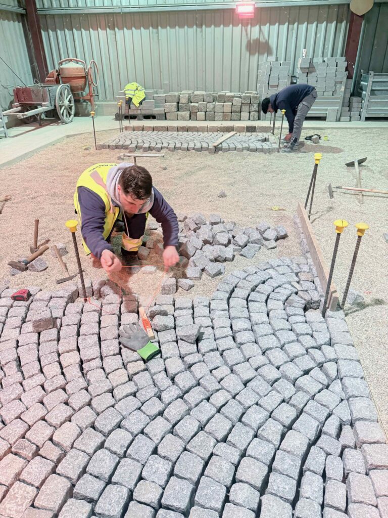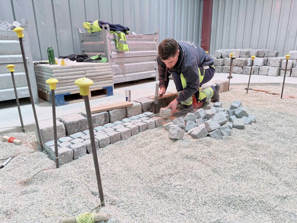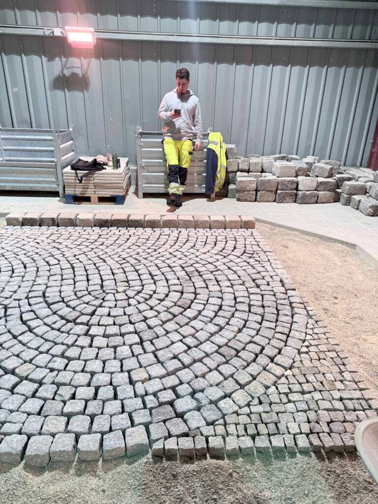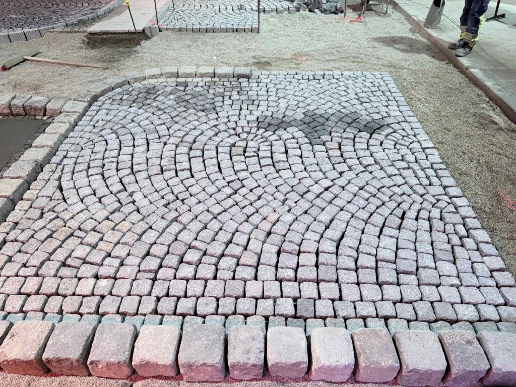 Granit-Kleinpflaster: Ausführung von Segmentbogen einschließlich Sonderformen und Richtungswechseln, Spitzgraben, Reihenpflaster sowie Kreispflasterungen.