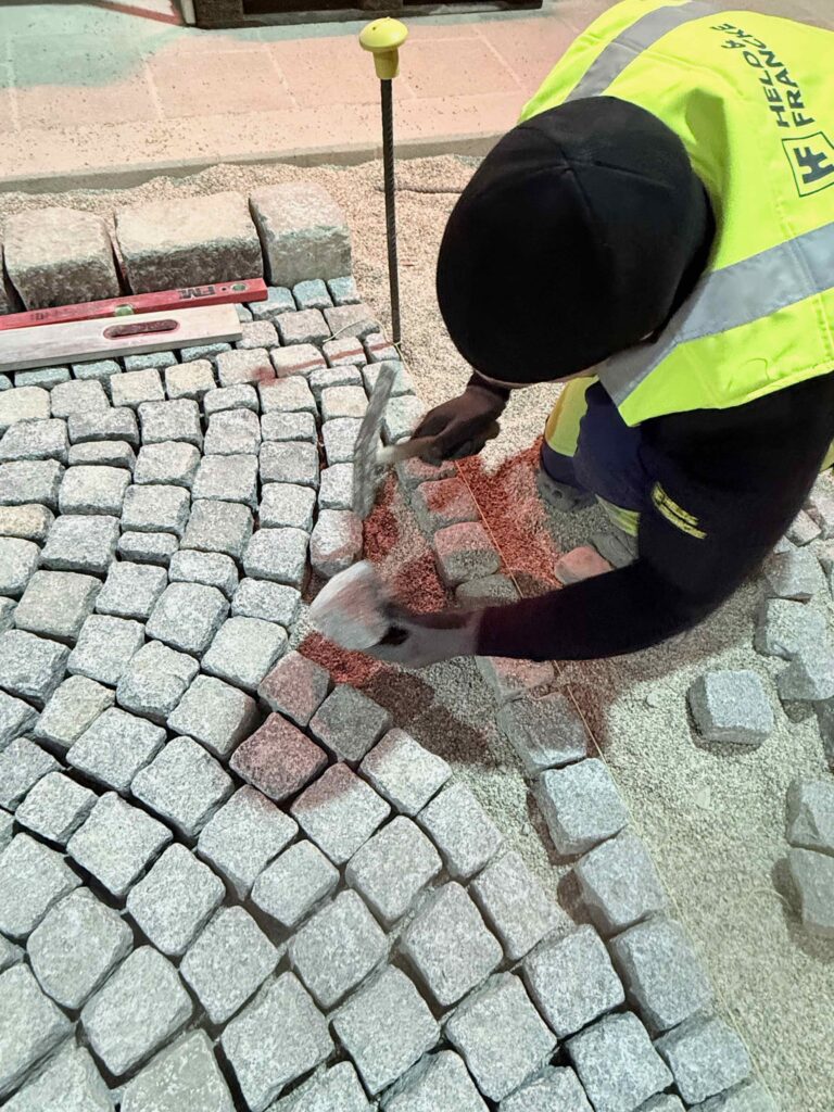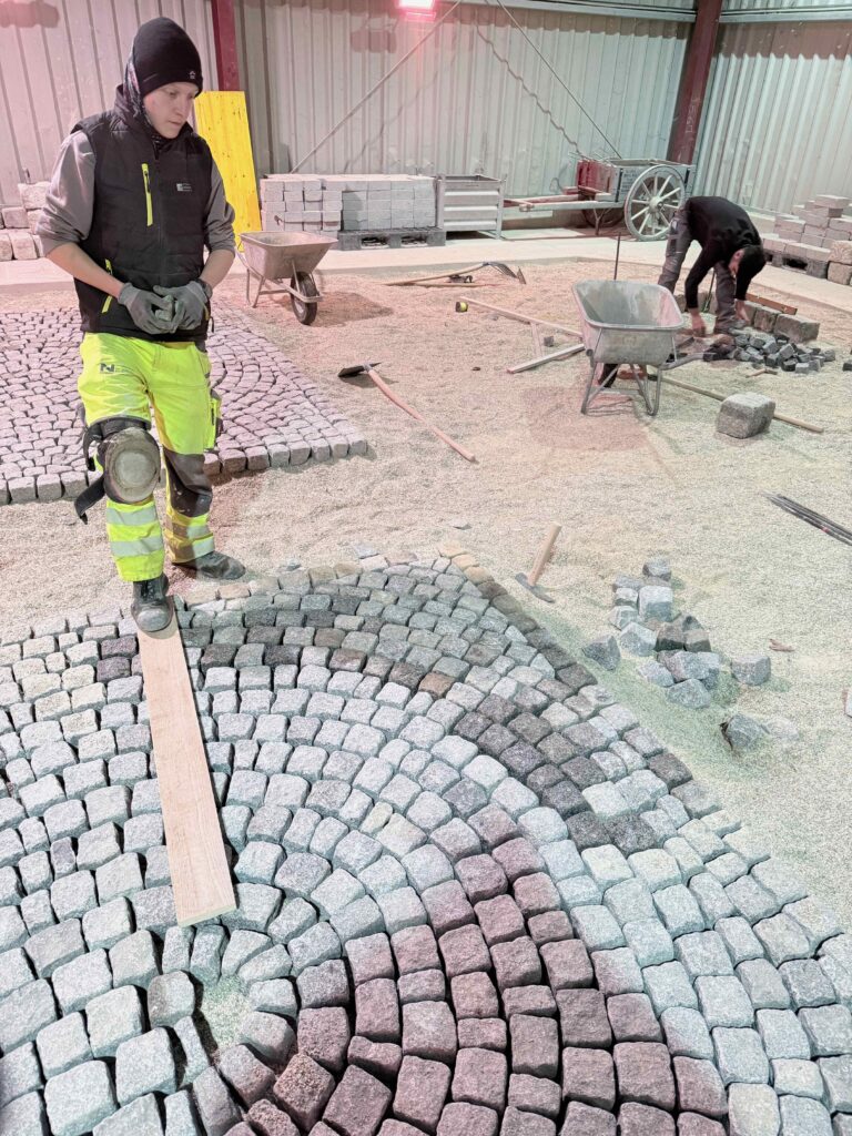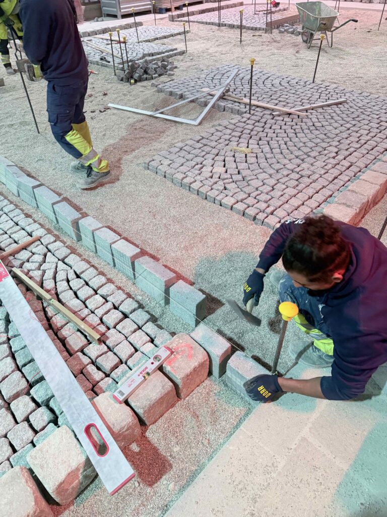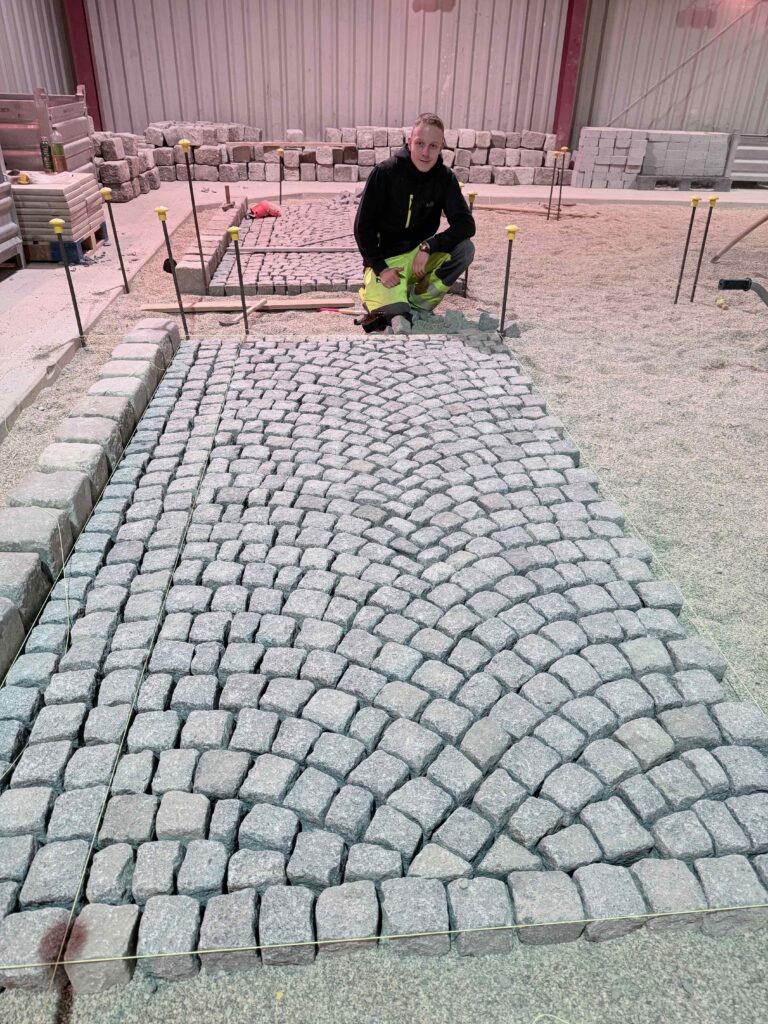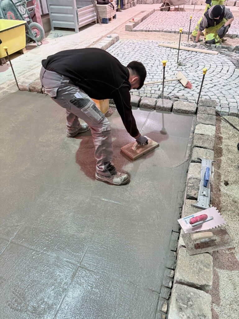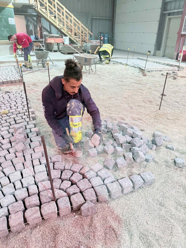 Granit-Kleinpflaster: Ausführung von Segmentbogen einschließlich Sonderformen und Richtungswechseln, Spitzgraben, Reihenpflaster sowie Kreispflasterungen.
