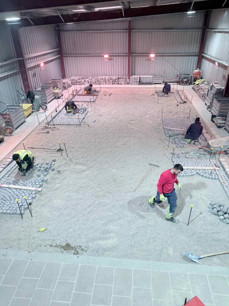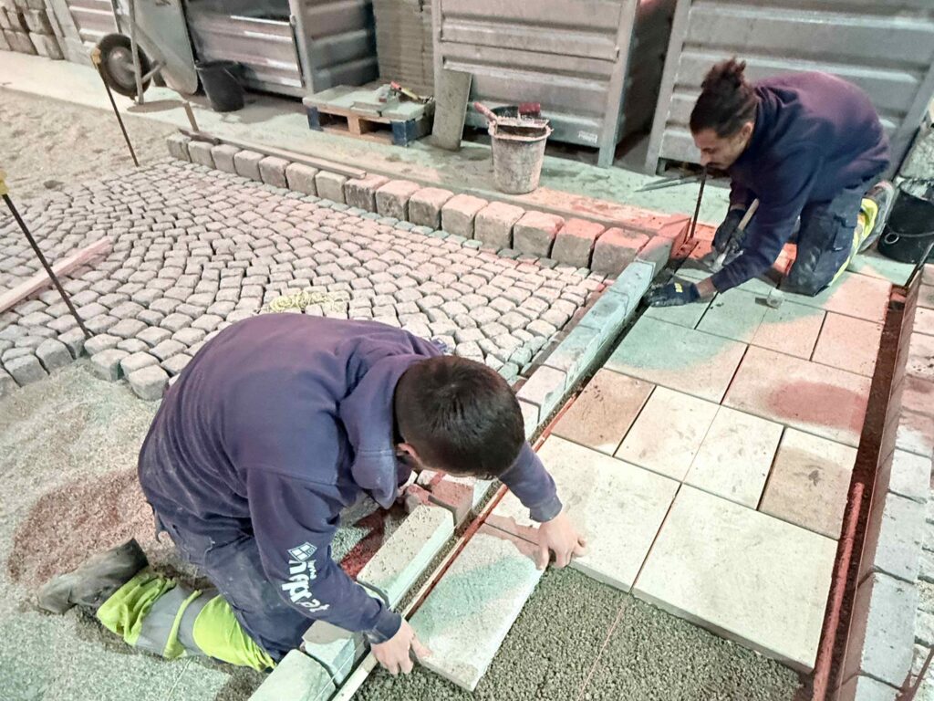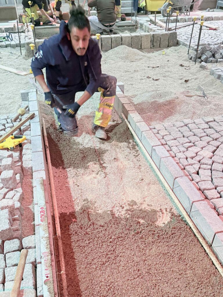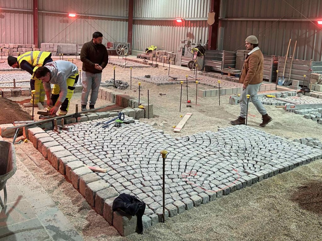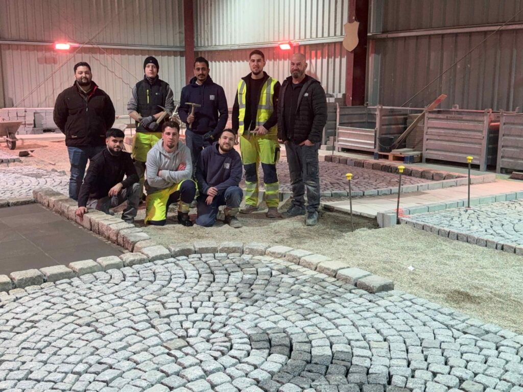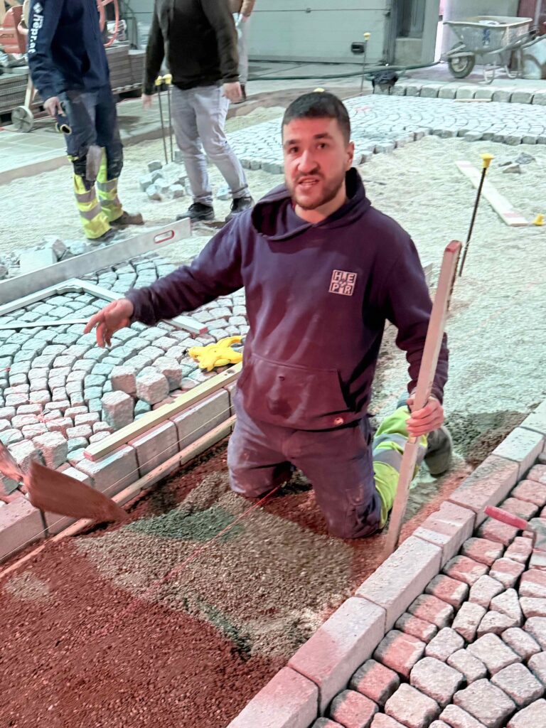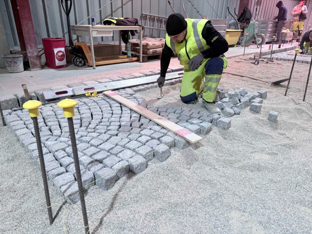 Granit-Kleinpflaster: Ausführung von Segmentbogen einschließlich Sonderformen und Richtungswechseln, Spitzgraben, Reihenpflaster sowie Kreispflasterungen.