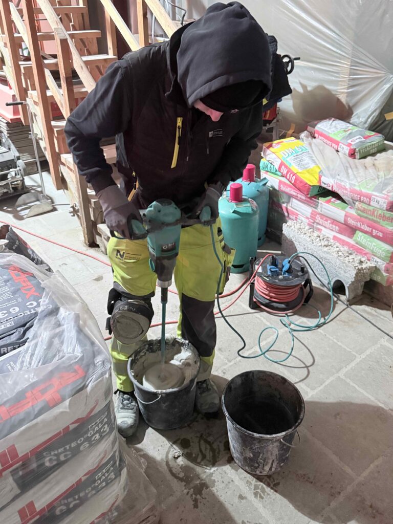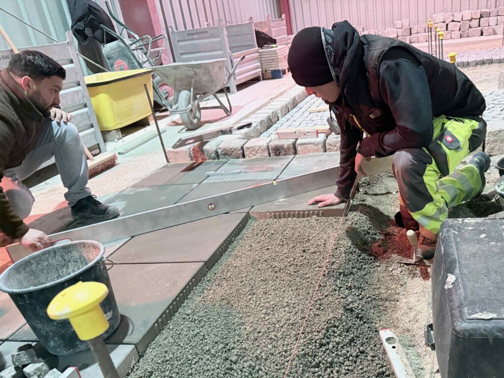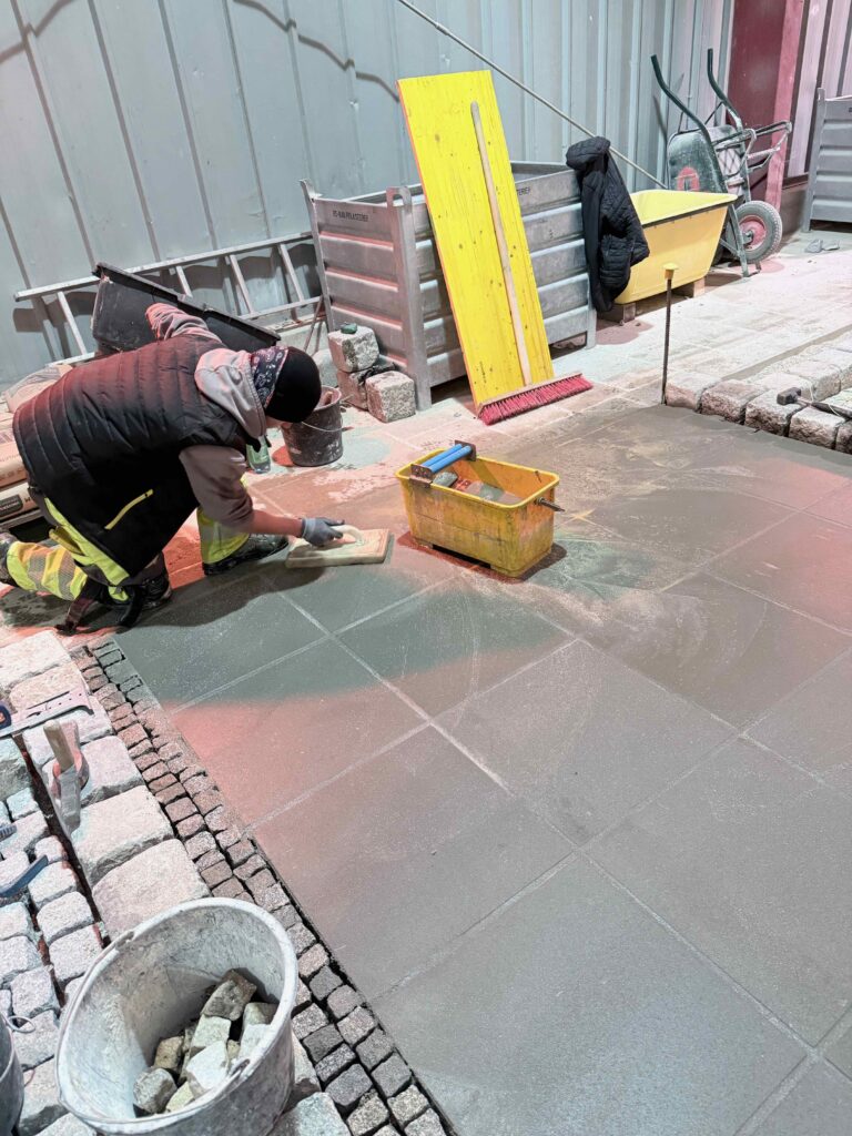 Natur- und Kunststeinplatten: Verlegung im Mörtelbett, fachgerechte Verfugung und Reinigung sowie Einsatz der Vakuum-Hebetechnik.